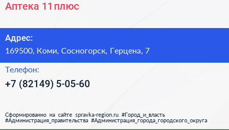 Аптека 11 плюс по адресу 169500, Коми, Сосногорск, Герцена, 7 в дальнейшем Организация, размещена в следующих категориях: