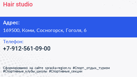 Hair studio по адресу 169500, Коми, Сосногорск, Гоголя, 6 в дальнейшем Организация, размещена в следующих категориях: