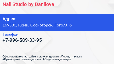 Nail Studio by Danilova по адресу 169500, Коми, Сосногорск, Гоголя, 6 в дальнейшем Организация, размещена в следующих категориях: