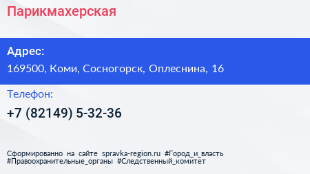 Парикмахерская по адресу 169500, Коми, Сосногорск, Оплеснина, 16 в дальнейшем Организация, размещена в следующих категориях:
