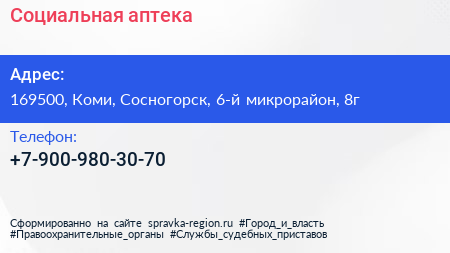 Социальная аптека по адресу 169500, Коми, Сосногорск, 6-й микрорайон, 8г в дальнейшем Организация, размещена в следующих категориях:
