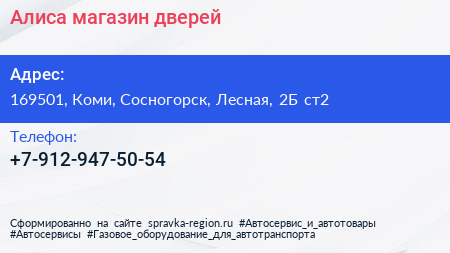 Алиса, магазин дверей по адресу 169501, Коми, Сосногорск, Лесная, 2Б ст2 в дальнейшем Организация, размещена в следующих категориях: