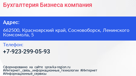 Бухгалтерия Бизнеса, компания по адресу 662500, Красноярский край, Сосновоборск, Ленинского Комсомола, 5 в дальнейшем Организация, размещена в следующих категориях: