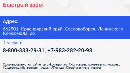 Быстрый заём по адресу 662501, Красноярский край, Сосновоборск, Ленинского Комсомола, 26 в дальнейшем Организация, размещена в следующих категориях: