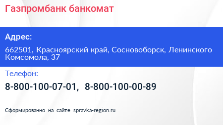 Газпромбанк, банкомат по адресу 662501, Красноярский край, Сосновоборск, Ленинского Комсомола, 37 в дальнейшем Организация, размещена в следующих категориях: