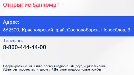 Открытие, банкомат по адресу 662500, Красноярский край, Сосновоборск, Новосёлов, 8 в дальнейшем Организация, размещена в следующих категориях: