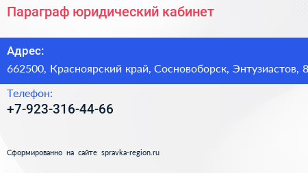 Параграф, юридический кабинет по адресу 662500, Красноярский край, Сосновоборск, Энтузиастов, 8 в дальнейшем Организация, размещена в следующих категориях: