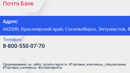 Почта Банк по адресу 662500, Красноярский край, Сосновоборск, Энтузиастов, 8 в дальнейшем Организация, размещена в следующих категориях: