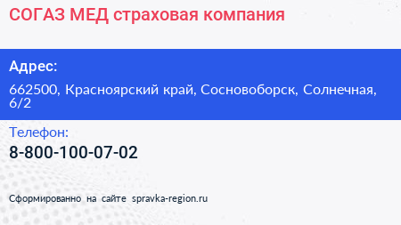 СОГАЗ-МЕД, страховая компания по адресу 662500, Красноярский край, Сосновоборск, Солнечная, 6/2 в дальнейшем Организация, размещена в следующих категориях: