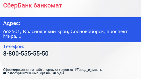 СберБанк, банкомат по адресу 662501, Красноярский край, Сосновоборск, проспект Мира, 1 в дальнейшем Организация, размещена в следующих категориях: