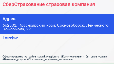 СберСтрахование, страховая компания по адресу 662501, Красноярский край, Сосновоборск, Ленинского Комсомола, 29 в дальнейшем Организация, размещена в следующих категориях: