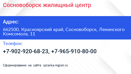 Сосновоборск, жилищный центр по адресу 662500, Красноярский край, Сосновоборск, Ленинского Комсомола, 11 в дальнейшем Организация, размещена в следующих категориях: