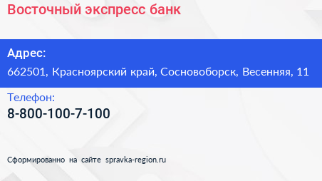 Восточный экспресс банк по адресу 662501, Красноярский край, Сосновоборск, Весенняя, 11 в дальнейшем Организация, размещена в следующих категориях: