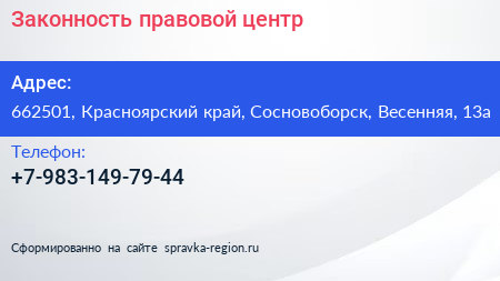 Законность, правовой центр по адресу 662501, Красноярский край, Сосновоборск, Весенняя, 13а в дальнейшем Организация, размещена в следующих категориях: