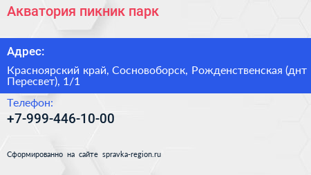 Акватория, пикник-парк по адресу Красноярский край, Сосновоборск, Рожденственская (днт Пересвет), 1/1 в дальнейшем Организация, размещена в следующих категориях: