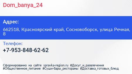 Dom_banya_24 по адресу 662518, Красноярский край, Сосновоборск, улица Речная, 8 в дальнейшем Организация, размещена в следующих категориях:
