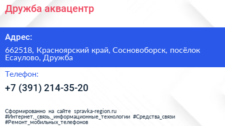 Дружба, аквацентр по адресу 662518, Красноярский край, Сосновоборск, посёлок Есаулово, Дружба в дальнейшем Организация, размещена в следующих категориях: