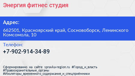 Энергия, фитнес-студия по адресу 662501, Красноярский край, Сосновоборск, Ленинского Комсомола, 10 в дальнейшем Организация, размещена в следующих категориях: