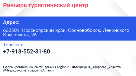 Ривьера, туристический центр по адресу 662501, Красноярский край, Сосновоборск, Ленинского Комсомола, 26 в дальнейшем Организация, размещена в следующих категориях: