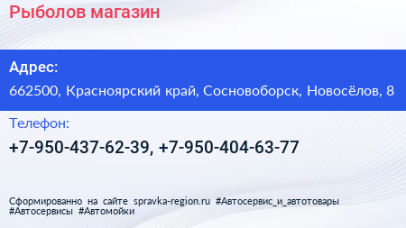 Рыболов, магазин по адресу 662500, Красноярский край, Сосновоборск, Новосёлов, 8 в дальнейшем Организация, размещена в следующих категориях: