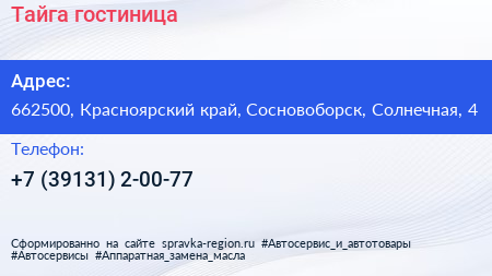 Тайга, гостиница по адресу 662500, Красноярский край, Сосновоборск, Солнечная, 4 в дальнейшем Организация, размещена в следующих категориях: