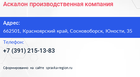 Аскалон, производственная компания по адресу 662501, Красноярский край, Сосновоборск, Юности, 35 в дальнейшем Организация, размещена в следующих категориях: