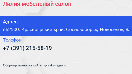 Лилия, мебельный салон по адресу 662500, Красноярский край, Сосновоборск, Новосёлов, 8а в дальнейшем Организация, размещена в следующих категориях: