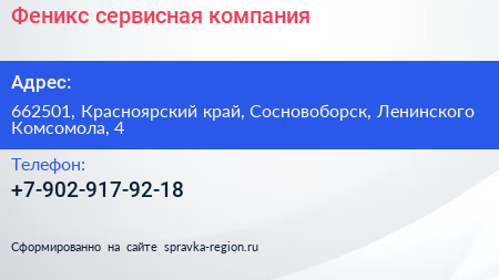 Феникс, сервисная компания по адресу 662501, Красноярский край, Сосновоборск, Ленинского Комсомола, 4 в дальнейшем Организация, размещена в следующих категориях:
