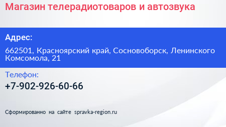 Магазин телерадиотоваров и автозвука по адресу 662501, Красноярский край, Сосновоборск, Ленинского Комсомола, 21 в дальнейшем Организация, размещена в следующих категориях: