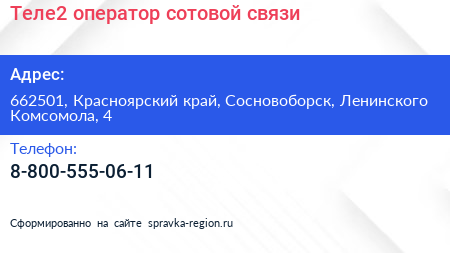 Теле2, оператор сотовой связи по адресу 662501, Красноярский край, Сосновоборск, Ленинского Комсомола, 4 в дальнейшем Организация, размещена в следующих категориях: