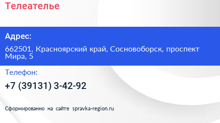 Телеателье по адресу 662501, Красноярский край, Сосновоборск, проспект Мира, 5 в дальнейшем Организация, размещена в следующих категориях: