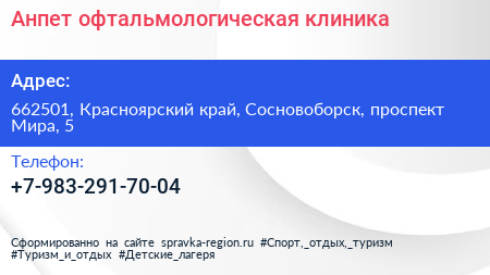 Анпет, офтальмологическая клиника по адресу 662501, Красноярский край, Сосновоборск, проспект Мира, 5 в дальнейшем Организация, размещена в следующих категориях: