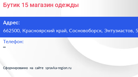 Бутик №15, магазин одежды по адресу 662500, Красноярский край, Сосновоборск, Энтузиастов, 5 в дальнейшем Организация, размещена в следующих категориях: