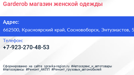 Garderob, магазин женской одежды по адресу 662500, Красноярский край, Сосновоборск, Энтузиастов, 5 в дальнейшем Организация, размещена в следующих категориях: