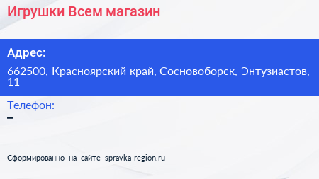 Игрушки Всем, магазин по адресу 662500, Красноярский край, Сосновоборск, Энтузиастов, 11 в дальнейшем Организация, размещена в следующих категориях: