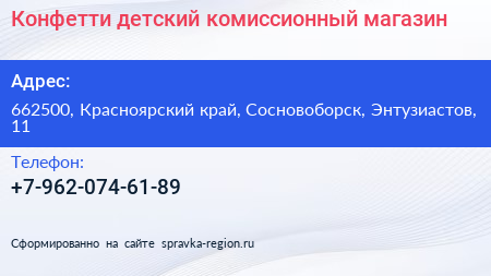 Конфетти, детский комиссионный магазин по адресу 662500, Красноярский край, Сосновоборск, Энтузиастов, 11 в дальнейшем Организация, размещена в следующих категориях: