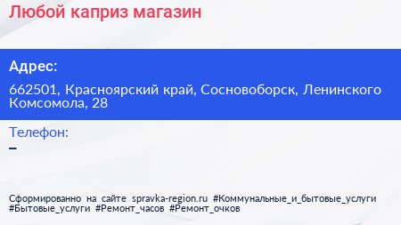 Любой каприз, магазин по адресу 662501, Красноярский край, Сосновоборск, Ленинского Комсомола, 28 в дальнейшем Организация, размещена в следующих категориях: