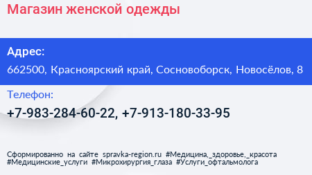 Магазин женской одежды по адресу 662500, Красноярский край, Сосновоборск, Новосёлов, 8 в дальнейшем Организация, размещена в следующих категориях:
