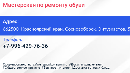 Мастерская по ремонту обуви по адресу 662500, Красноярский край, Сосновоборск, Энтузиастов, 5 в дальнейшем Организация, размещена в следующих категориях:
