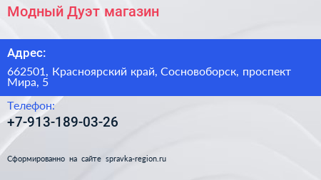 Модный Дуэт, магазин по адресу 662501, Красноярский край, Сосновоборск, проспект Мира, 5 в дальнейшем Организация, размещена в следующих категориях: