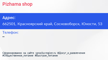 Pizhama shop по адресу 662501, Красноярский край, Сосновоборск, Юности, 53 в дальнейшем Организация, размещена в следующих категориях: