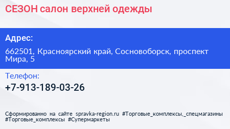 СЕЗОН, салон верхней одежды по адресу 662501, Красноярский край, Сосновоборск, проспект Мира, 5 в дальнейшем Организация, размещена в следующих категориях: