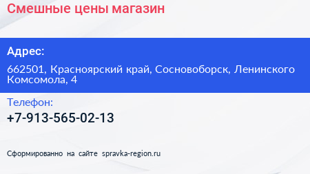 Смешные цены, магазин по адресу 662501, Красноярский край, Сосновоборск, Ленинского Комсомола, 4 в дальнейшем Организация, размещена в следующих категориях: