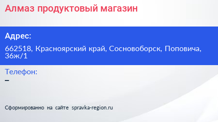 Алмаз, продуктовый магазин по адресу 662518, Красноярский край, Сосновоборск, Поповича, 36ж/1 в дальнейшем Организация, размещена в следующих категориях: