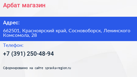 Арбат, магазин по адресу 662501, Красноярский край, Сосновоборск, Ленинского Комсомола, 28 в дальнейшем Организация, размещена в следующих категориях: