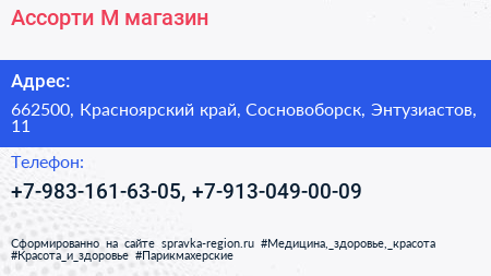 Ассорти-М, магазин по адресу 662500, Красноярский край, Сосновоборск, Энтузиастов, 11 в дальнейшем Организация, размещена в следующих категориях:
