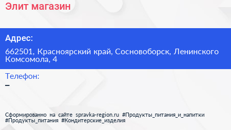 Элит, магазин по адресу 662501, Красноярский край, Сосновоборск, Ленинского Комсомола, 4 в дальнейшем Организация, размещена в следующих категориях: