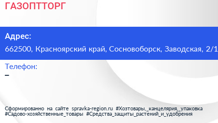 ГАЗОПТТОРГ по адресу 662500, Красноярский край, Сосновоборск, Заводская, 2/1 в дальнейшем Организация, размещена в следующих категориях: