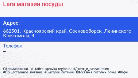 Lara, магазин посуды по адресу 662501, Красноярский край, Сосновоборск, Ленинского Комсомола, 4 в дальнейшем Организация, размещена в следующих категориях: