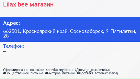 Lilax bee, магазин по адресу 662501, Красноярский край, Сосновоборск, 9 Пятилетки, 28 в дальнейшем Организация, размещена в следующих категориях: